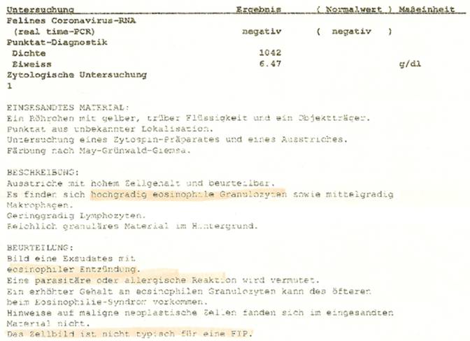Der sofort gemessene Eiweiß-Gehalt lag bei 5,9 g/dl und war ganz leicht fadenziehend: Hochverdächtig für FIP, umso überraschender die Antwort des Labors: |